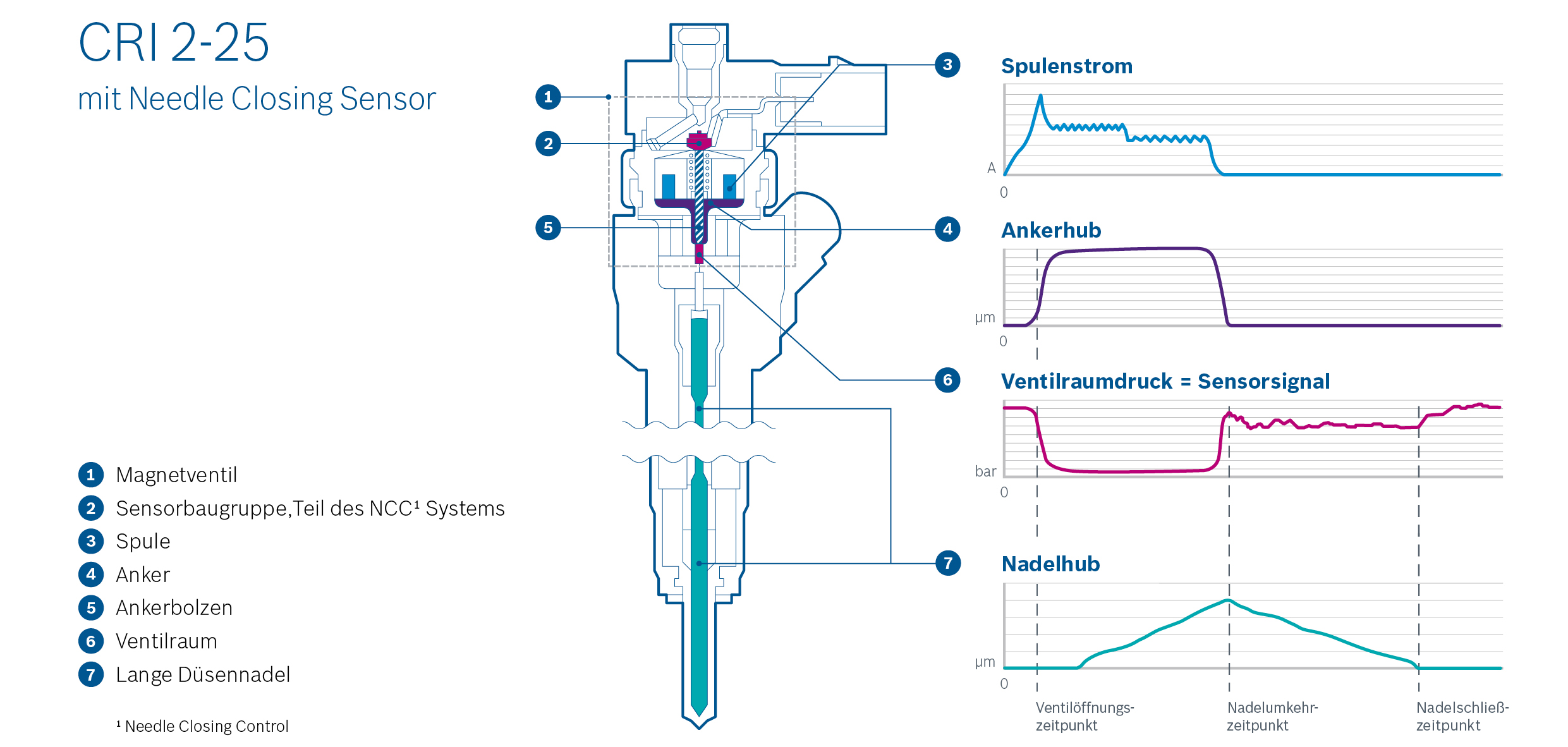 The new needle-closing control (NCC) tech-nology can precisely measure and control the duration of fuel injection in real driving conditions – accurate to just a few millionths of a second. To achieve this, a sensor is in-tegrated into a solenoid-valve injector and paired with a cutting-edge, intelligent control software application.
