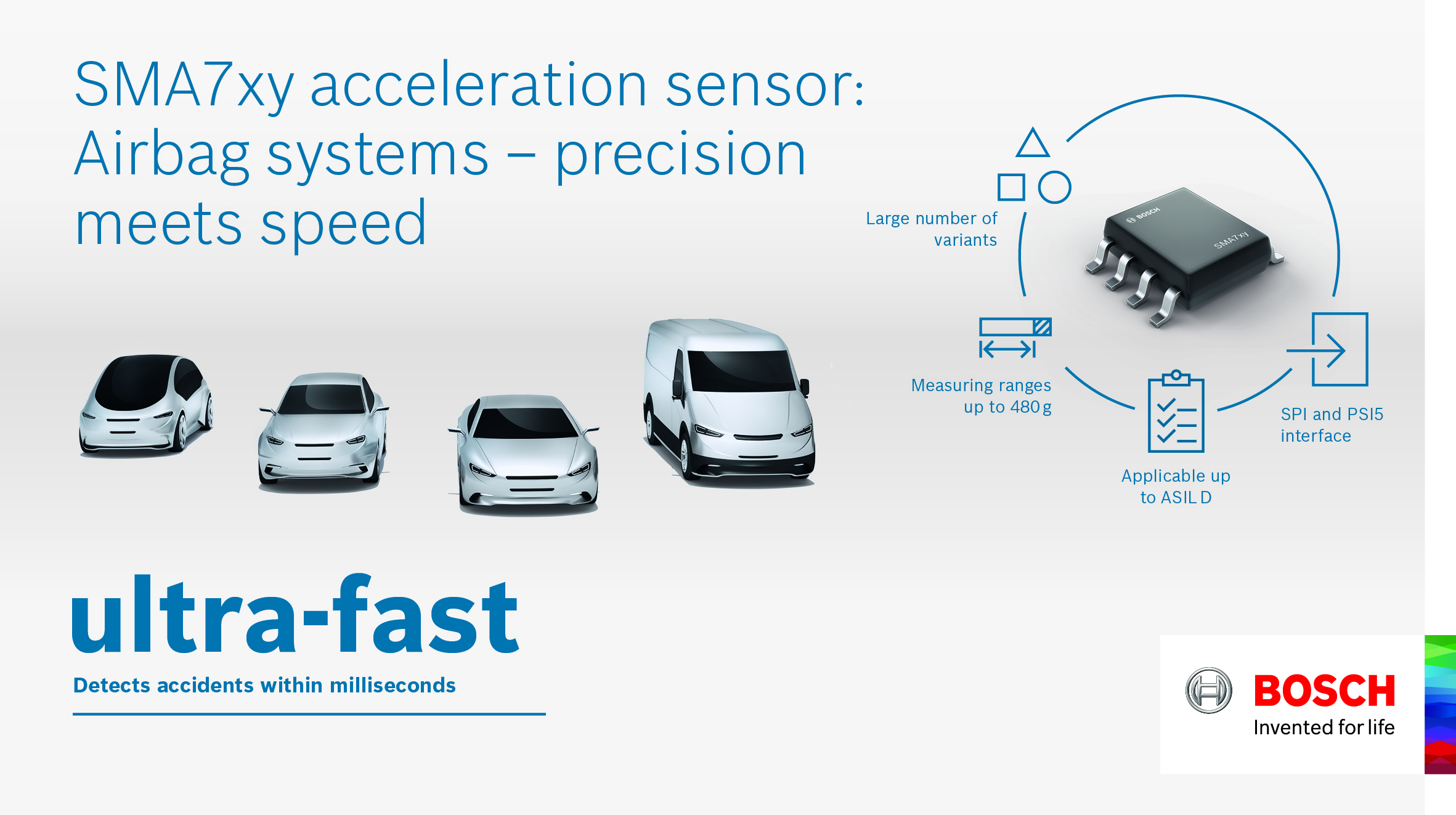The SMA7xy sensor family improves safety for car drivers and passengers. When the acceleration sensors detect a collision, the passive safety systems such as airbags can now be deployed earlier, and the restraining effect can be precisely set for the given accident scenario.