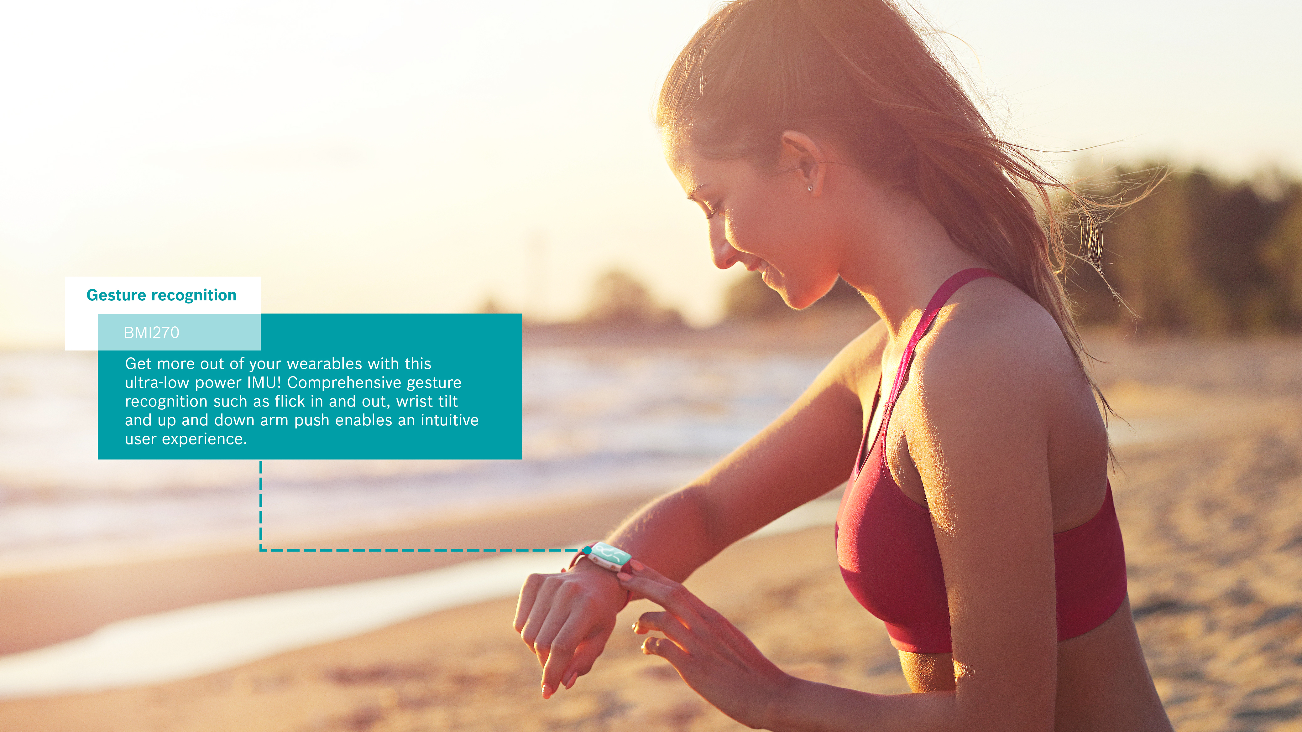 The BMI270 includes intuitive gesture recognition with an integrated plug-and-play step counter, which is specially optimized for accurate step counting in wrist-worn devices. The sensor detects gestures including flick in/out, arm up/down, and wrist tilt for the intuitive operation of for example smartwatches.