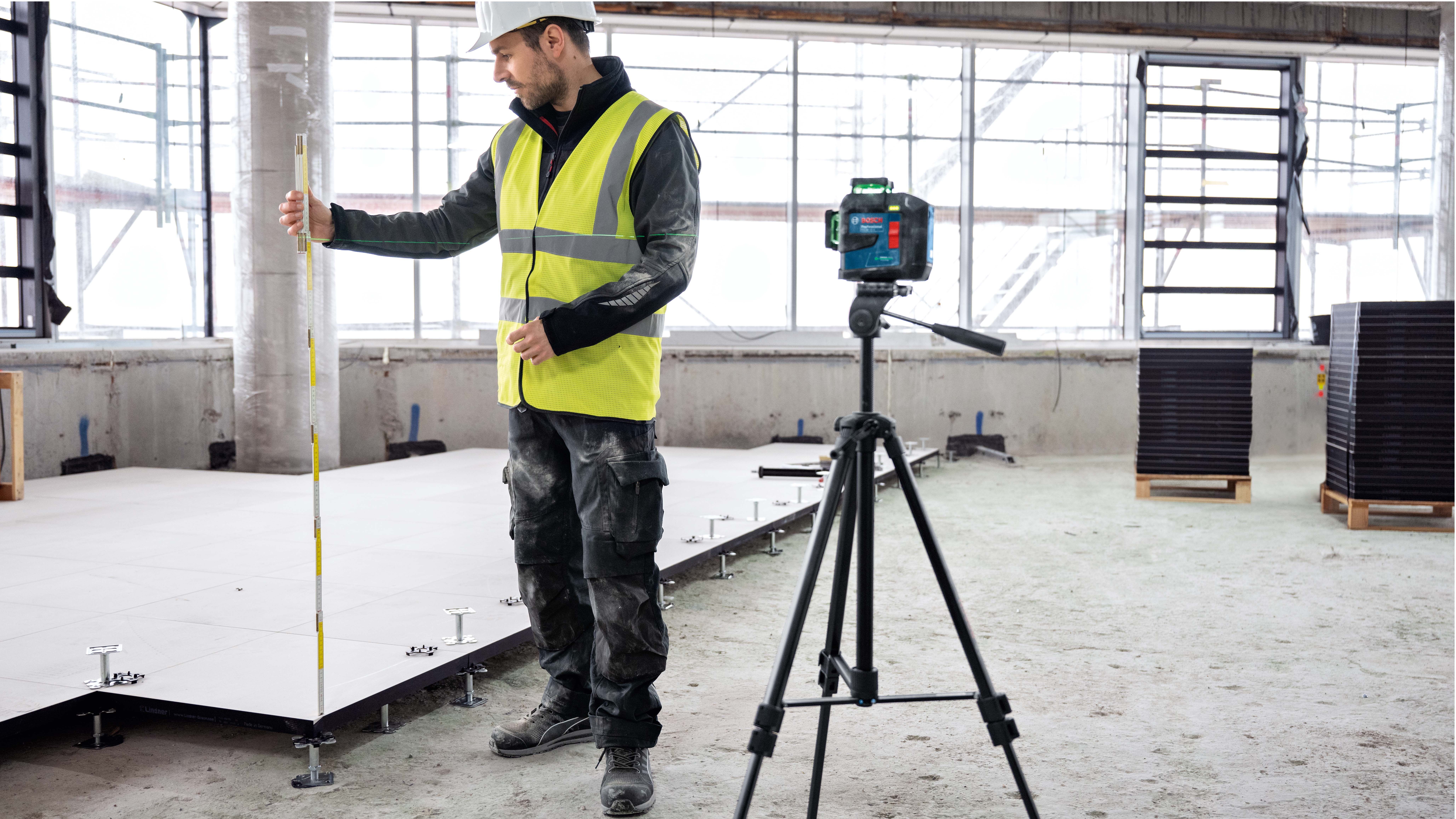 The 360°-line laser GLL 80-33 G Professional makes precision leveling a breeze for tradespeople and is perfect for interior tasks such as installation of cavity floors. It projects one horizontal and two vertical lines and is compatible with laser receivers for even greater range at radius of 80 meters. The receiver mode for working with a laser receiver is always on automatically, so no additional button is required. With the universal bracket included, the line laser can be attached to almost any surface with screws or through the integrated magnets. The GLL 80-33 G Professional features a 1/4” thread and a 5/8” thread for working with a tripod.