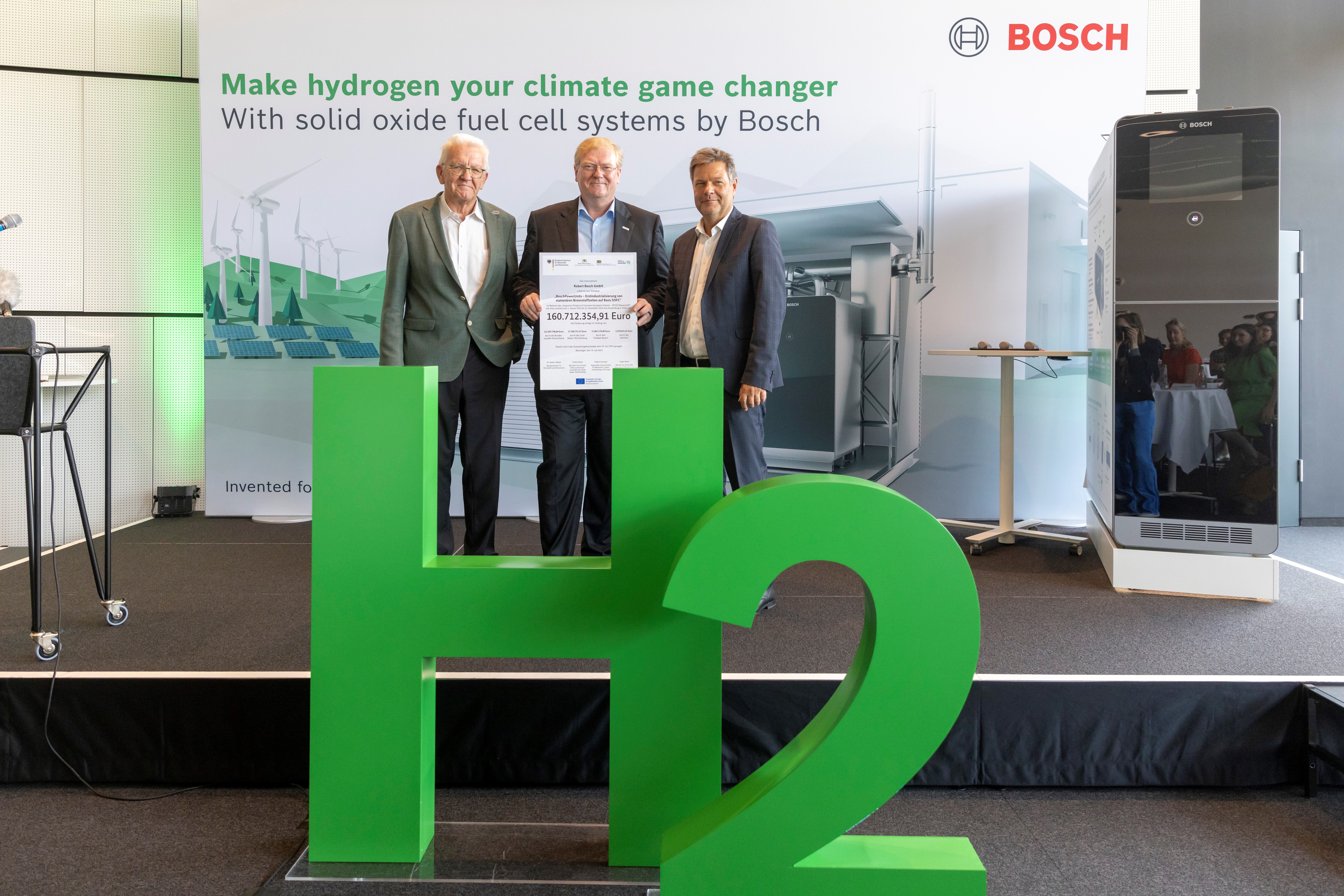 From left to right: Baden-Württemberg Minister-President Winfried Kretschmann, Chairman of the Bosch Board of Management Stefan Hartung, and Federal Minister for Economic Affairs and Climate Action Robert Habeck at the presentation of a certificate confirming funding for the IPCEI hydrogen project Bosch Power Units.
