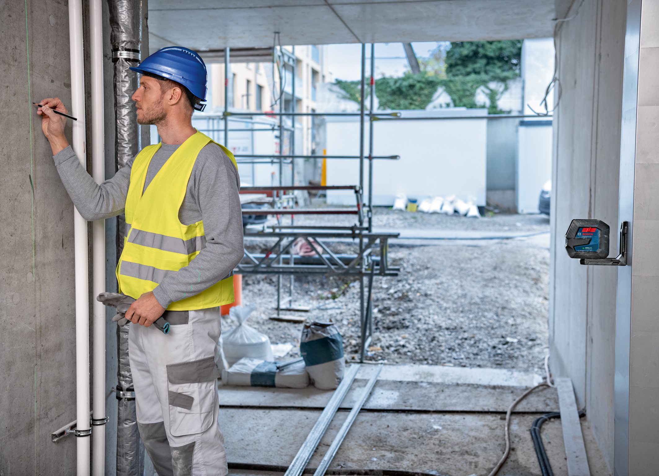 The line laser GLL 2-15 G Professional can be flexibly mounted and used just like the combi laser GCL 2-50 G Professional. The different mounts, in this case the LB 10 Professional, are simply screwed to wooden beams or adhere to iron girders and other magnetic components due to particularly strong magnets. Furthermore, both lasers can be mounted on standard tripods with a ¼” thread or suspended from existing profiles using a ceiling clamp.