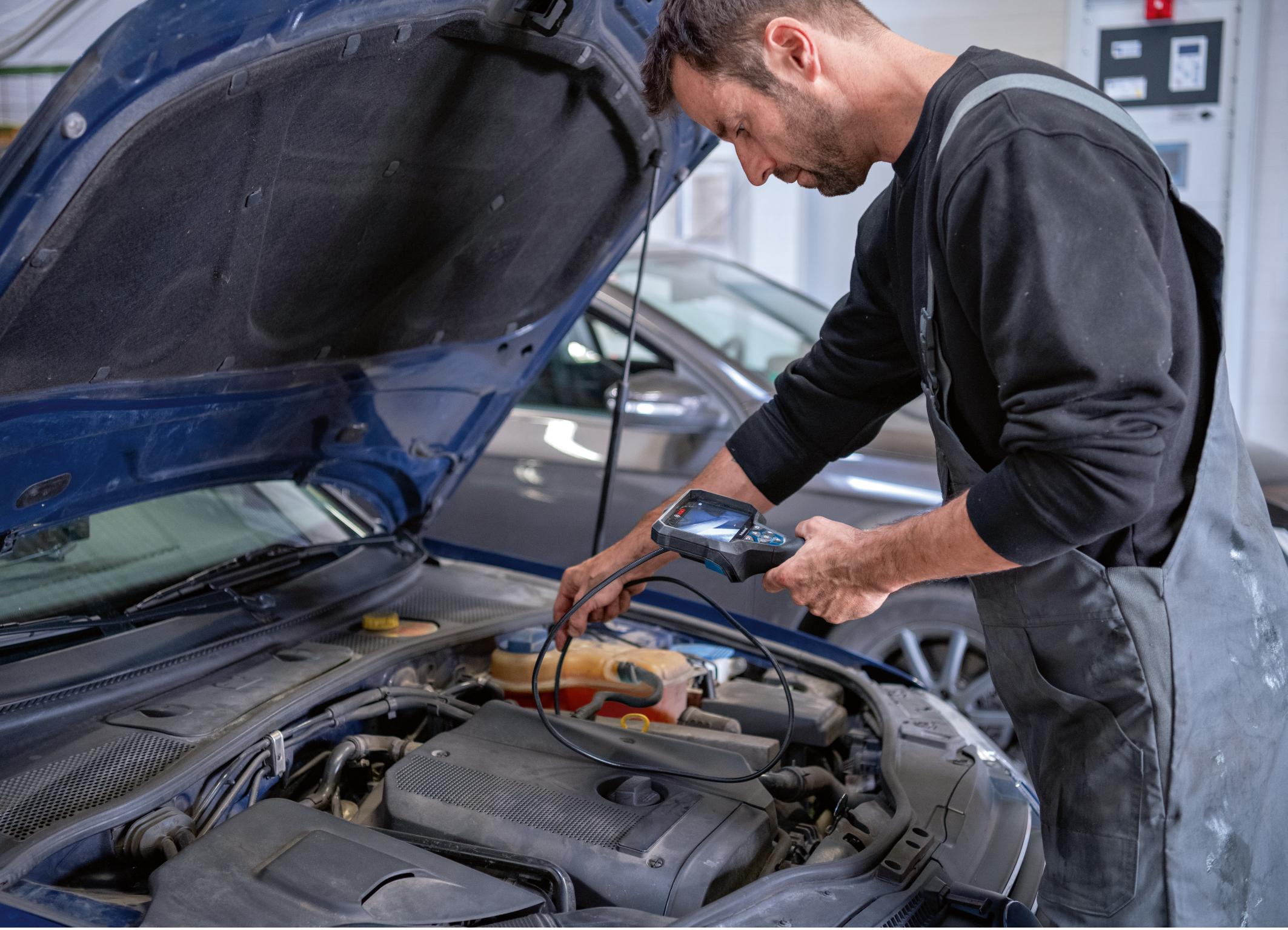 The inspection cameras GIC 12V-5-27 C Professional (in picture) and GIC 12V-4-23 C Professional are especially robust thanks to the shock- absorbing rubber casing. The display is also slightly set back to further protect it from impacts. The IP54 protection rating guarantees that the tool can be used in areas full of dust or splash water without any issue. The cable and camera together have an IP67 protection rating and are also resistant in saltwater, ethanol, diesel, engine oil, gasoline, and AdBlue® for 30 minutes, making them suitable for automotive inspection. Even extremely hard-to-reach areas like inside the engine compartment when inspecting cars can be reached by the cameras, and the inspection can be documented with images or, if using the GIC 12V-5-27 C Professional, even a video.