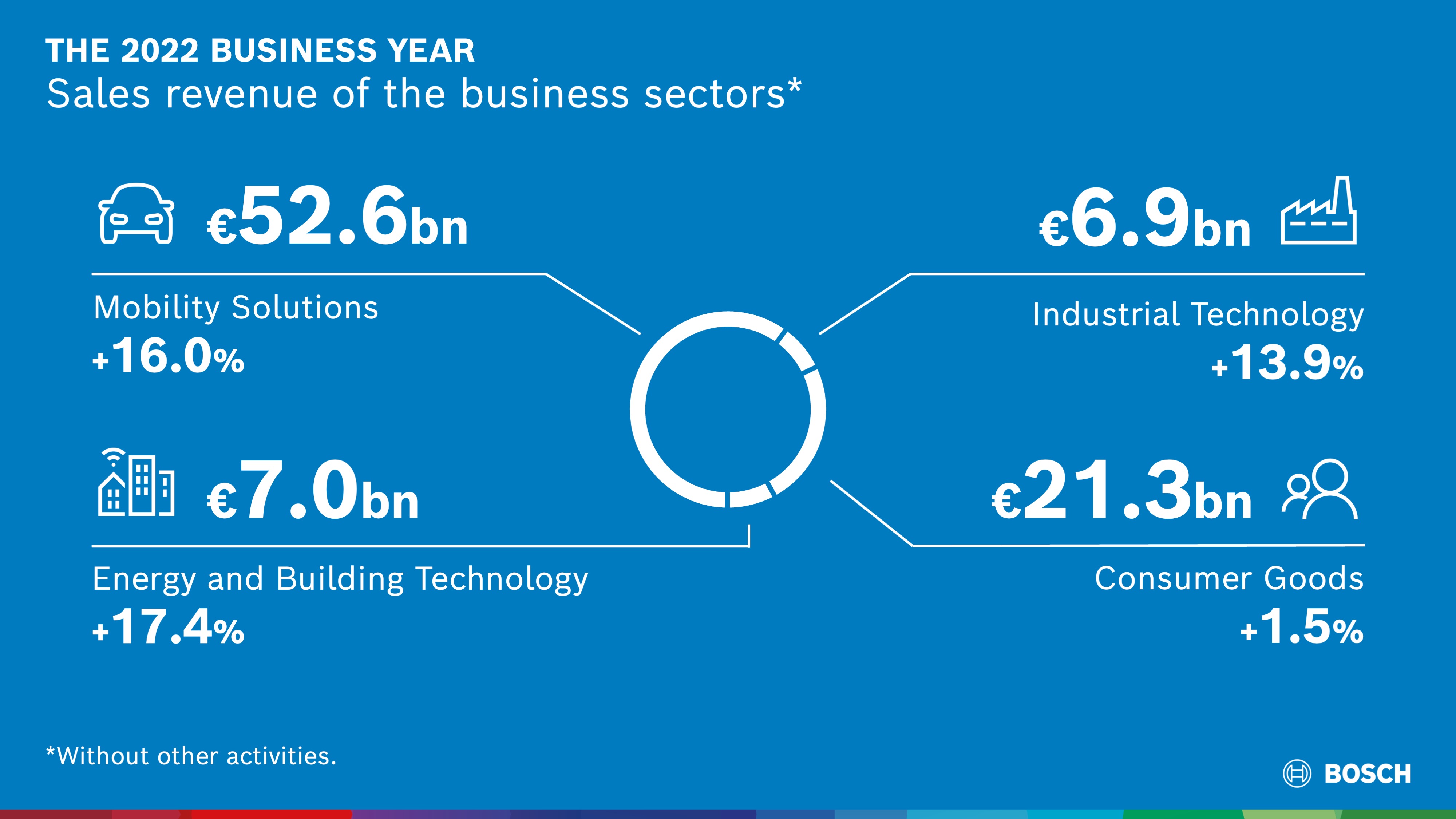 Bosch exceeded its business targets in what was a challenging year. The supplier of technology and services increased its total sales to 88.2 billion euros. That is an increase of 12.0 percent. Mobility Solutions, the company’s biggest business sector, significantly increased its sales by 16 percent (12.1 percent after adjusting for exchange-rate effects) to 52.6 billion euros. In the Industrial Technology business sector, sales rose 13.9 percent to 6.9 billion euros. Adjusted for exchange-rate effects, the figure was 11 percent. Consumer Goods increased its sales by 1.5 percent to 21.3 billion euros. After adjusting for exchange-rate effects, the sales increase was 1.6 percent. The Energy and Building Technology business sector grew significantly in 2022, by 17.4 percent (15.9 percent after adjusting for exchange-rate effects), to 7 billion euros.