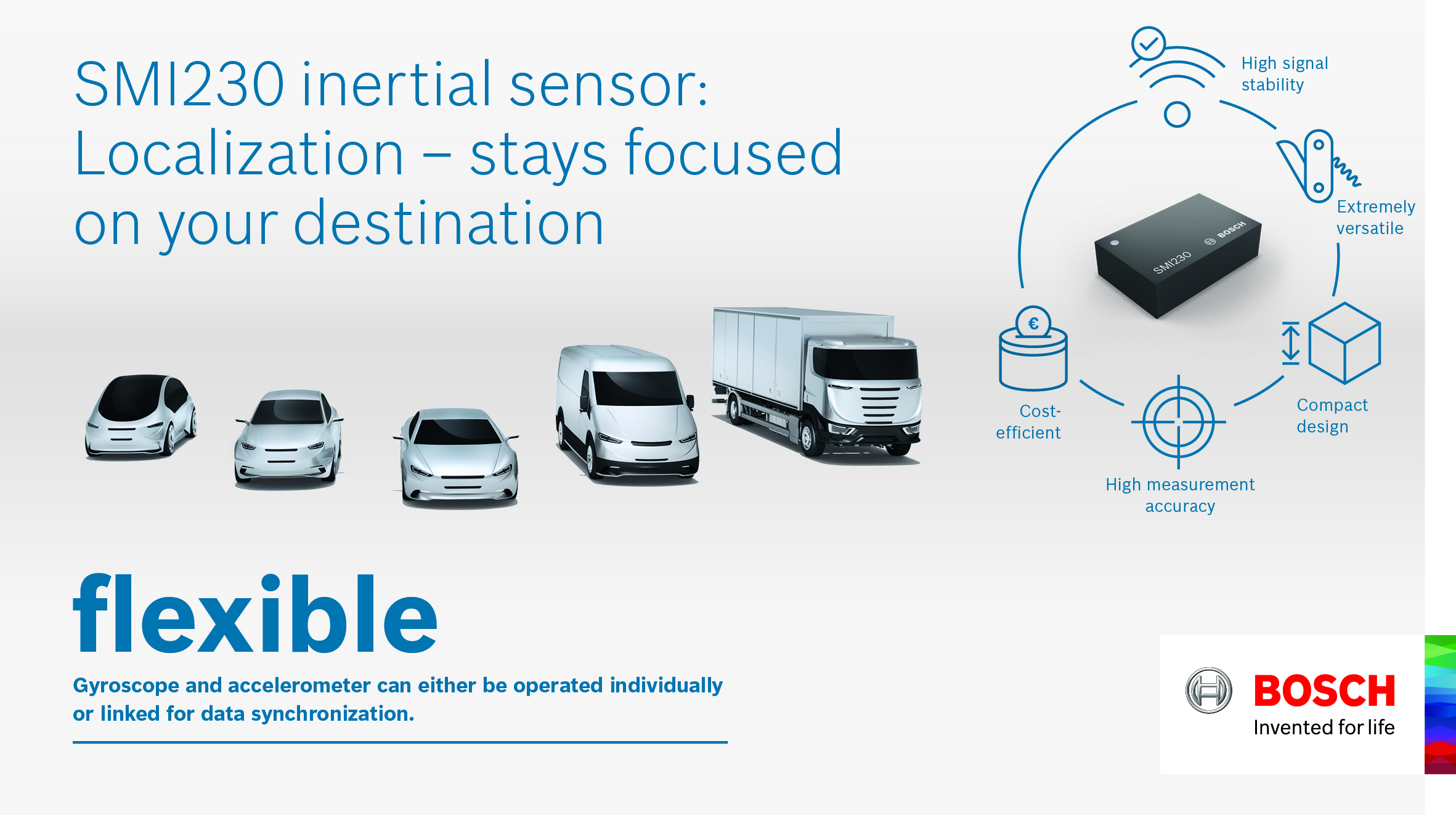 At Munich's world-renowned electronics exhibition: electronica, Bosch today announced the new SMI230 six-axis inertial sensor. With this sensor onboard, navigation systems will not take their eye off the destination – even when the GPS signal is interrupted. The SMI230 from Bosch provides the navigation system with motion data, enabling the current position of the travelling vehicle to be determined even when the GPS signal is weak or nonexistent. Navigation systems will become even more precise and reliable.
