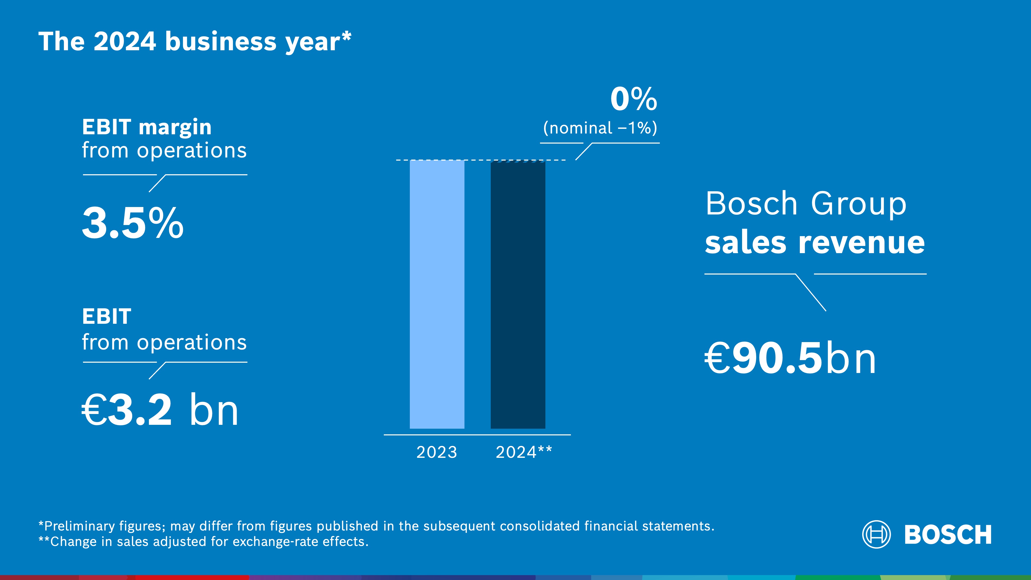 Bosch, the supplier of technology and services, generated sales revenue of 90.5 billion euros in 2024, according to preliminary figures. In nominal terms, this is a 1 percent year-on-year fall, and roughly on a par with the previous year when adjusted for exchange-rate effects. This equates to an EBIT margin from operations of 3.5 percent. In addition to the weak growth of the global economy, business development was adversely affected by the fact that growth markets such as electromobility developed much more slowly than expected.