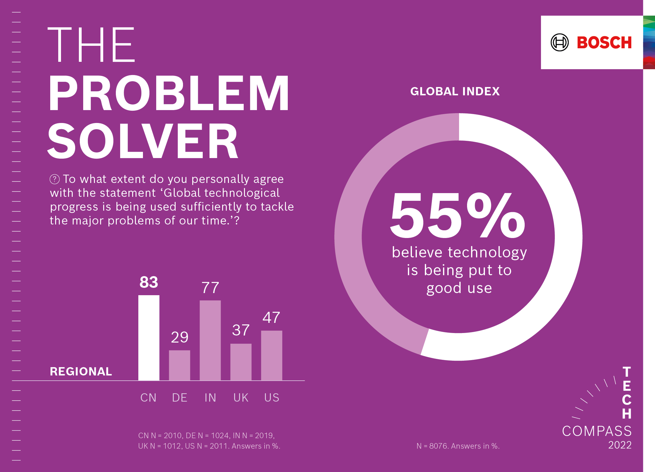 While most Chinese (83 percent) and Indian respondents (77 percent) are more confident that technology is currently being used sufficiently to tackle the major problems of our time, only a minority of people in the U.S. (47 percent), the U.K. (37 percent), and Germany (29 percent) believe this.