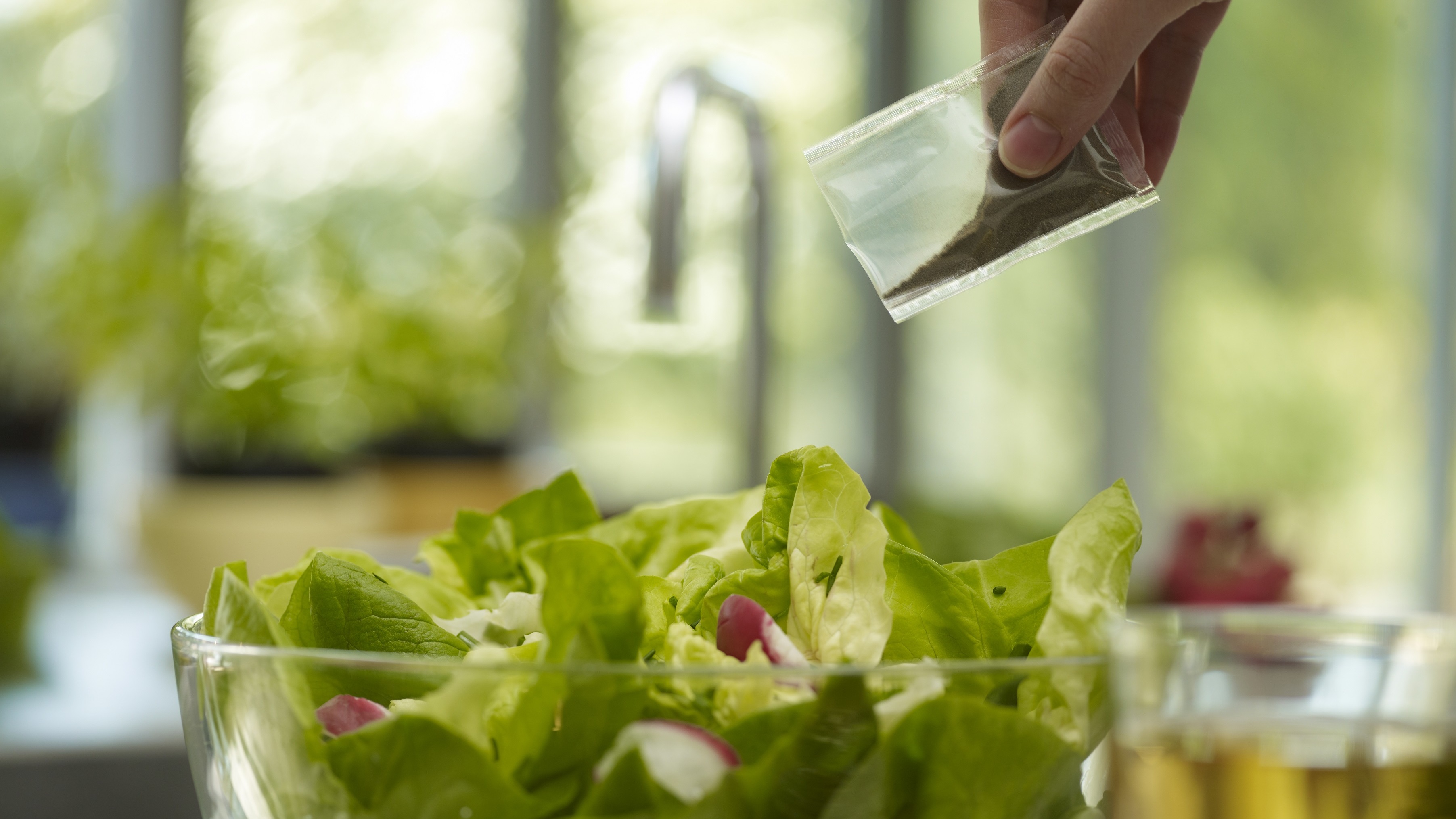 Powders such as condiments are packaged in small, convenient and easily portioned flat pouches.
