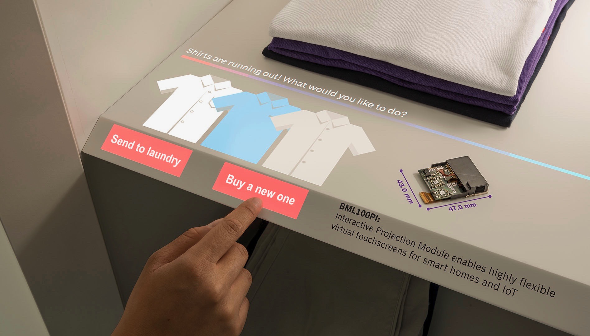 The BML100PI module offers a complete, ready-to-use solution for interactive projection, enabling highly flexible virtual touchscreens. It enables a highly intuitive user experience for any smart home appliances as a fully flexible alternative compared to a static, physical screen.