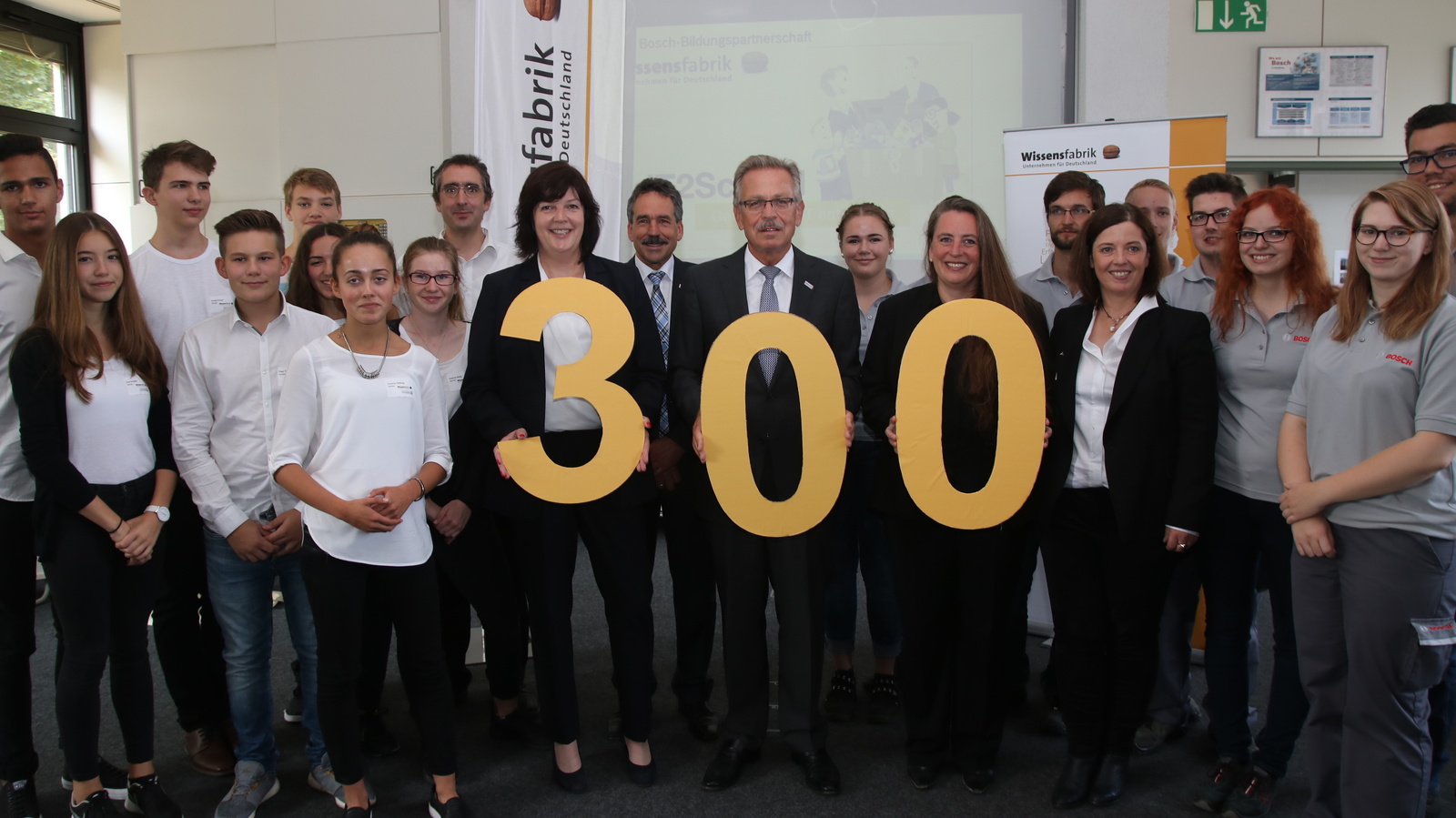 Bosch unterzeichnet 300. Wissensfabrik-Partnerschaft: Schülerinnen und Schüler des Gymnasiums am Krebsberg mit Bosch-Auszubildenden bei der feierlichen Unterzeichnung des Partnerschaftsvereinbarung. Im Bild: Karin Gilges, Kaufmännische Werkleiterin am Standort Homburg (1. Reihe, 6.v.r.), Thomas Gönner, Technischer Werkleiter am Standort Homburg, (2. Reihe, 5..v.l.), Dr. Carsten Schwender, Lehrer Gymnasium am Krebsberg (2. Reihe, 4.v.l.), Franz Fehrenbach, Lenkungskreisvorsitzender der Wissensfabrik (1. Reihe. 5.v.r.), Andrea Becker, Staatssekretärin im Ministerium für Bildung und Kultur des Saarlands (1. Reihe, 4.v.r.) und Sigrid Maschlanka, Leiterin Gymnasium am Krebsberg (1. Reihe, 3.v.r.).