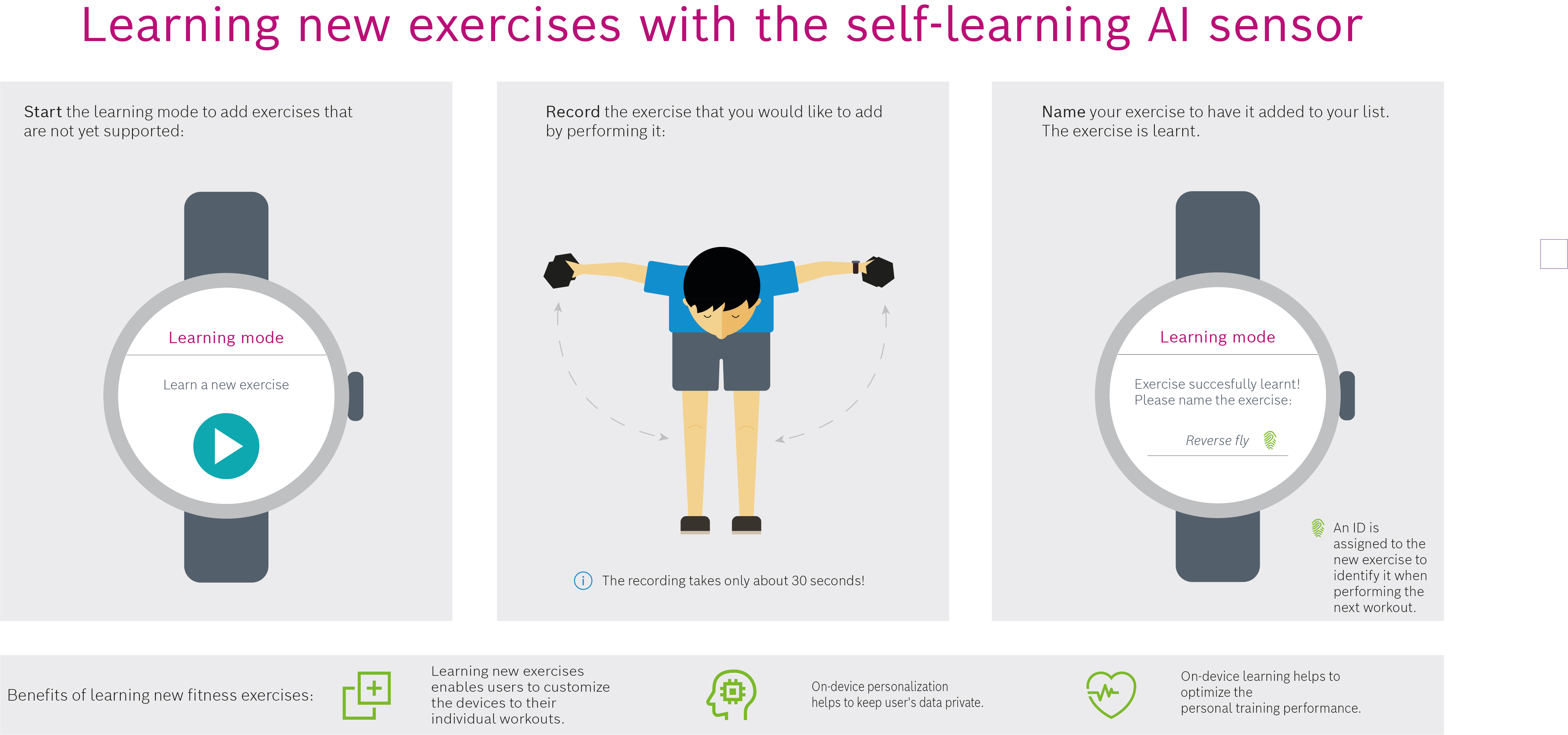 The learning mode offers users the option to add new fitness activities that were originally not supported, enabling them to customize the device to their individual needs due to the self-learning AI sensor from Bosch Sensortec. The personalization feature enables users to adapt existing, pre-learnt activities to their own individual style, increasing the accuracy of calorie counting and activity analyses.