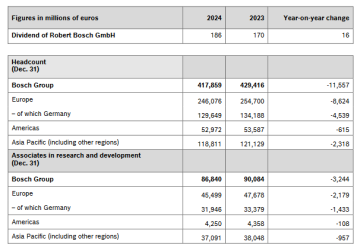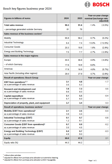 Stuttgart / Renningen, Duitsland – De Bosch Groep zet zijn ambitieuze Strategie 2030 voort om zijn concurrentiepositie te versterken, al heeft de marktomgeving de groei in 2024 aanzienlijk afgeremd. De technologie- en dienstenleverancier realiseerde in 2024 90,3 miljard euro omzet. Dat is 1,4 procent minder dan in het jaar voordien, of 0,5 procent minder na verrekening van de wisselkoerseffecten. De EBIT (Earnings Before Interest & Taxes) uit bedrijfsactiviteiten bereikte 3,1 miljard euro (2023: 4,8 miljard euro); de EBIT-bedrijfsmarge bedroeg 3,5 procent. Naar aanleiding van de presentatie van de jaarcijfers van het bedrijf verklaart Stefan Hartung, voorzitter van de raad van bestuur van Robert Bosch GmbH, het volgende: "We hebben in boekjaar 2024 belangrijke verbeteringen gerealiseerd op het vlak van kosten, structuren en portfolio. We houden vast aan onze ambitieuze doelstellingen om te blijven groeien en onze financiële zelfstandigheid te versterken. Onze Strategie 2030 bepaalt onze koers, zeker in tijden van wereldwijde turbulentie, om uiterlijk binnen vijf jaar tot de top drie van de grootste spelers op onze kernmarkten te behoren."