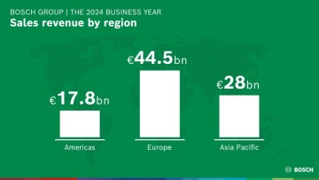 Bosch voelde de zwakte van zijn kernmarkten het sterkst in Europa. Terwijl de omzet in deze regio met 4,9 procent daalde (4,6 procent na verrekening van de wisselkoerseffecten) naar 44,5 miljard euro, zag het bedrijf een groei in de andere regio’s van de wereld: met 4,8 procent (5,7 procent na verrekening van de wisselkoerseffecten) naar 17,8 miljard euro op het Amerikaanse continent en met 0,7 procent (2,8 procent na verrekening van de wisselkoerseffecten) naar 28 miljard euro in Azië-Pacific.