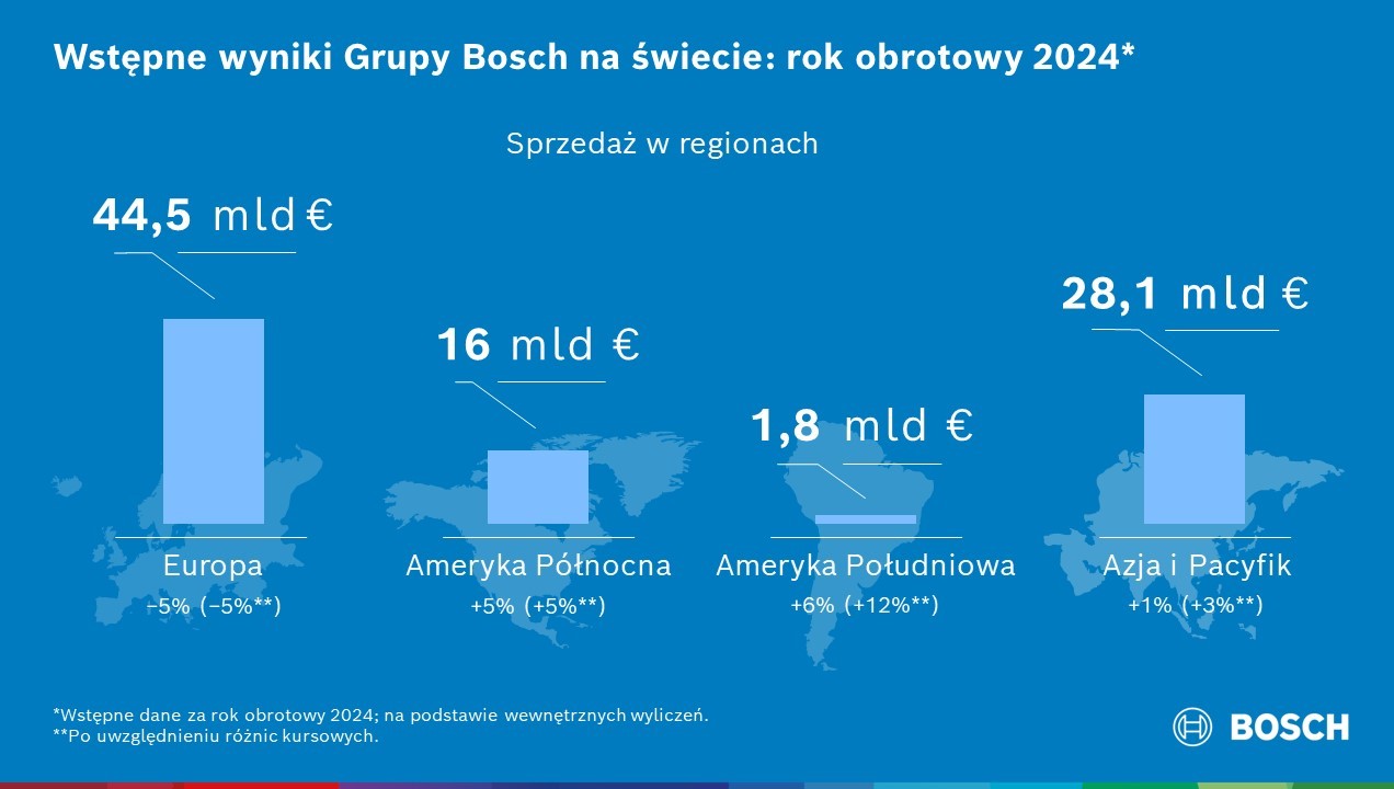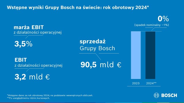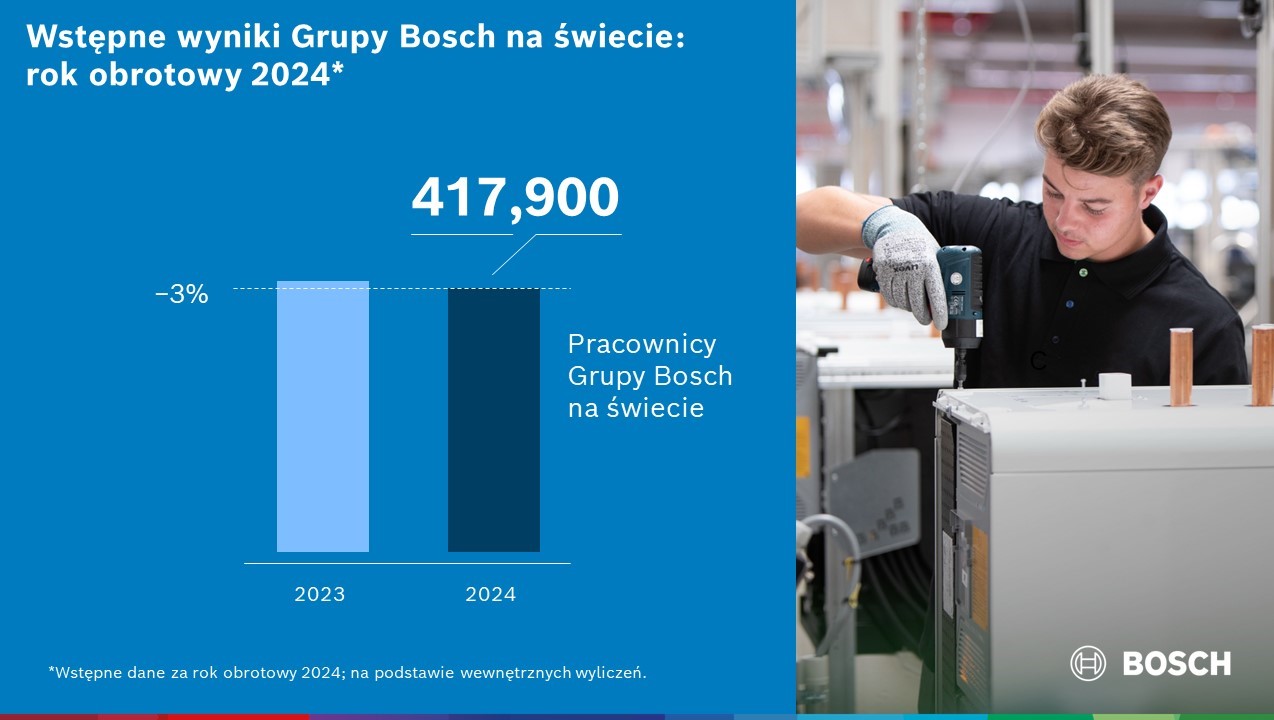 Według wstępnych danych, Bosch zakończył rok 2024 z ponad 1,7 mld euro (7,5 mld złotych) skonsolidowanej sprzedaży w Polsce, odnotowując spadek obrotów o 1,5 procent w euro (6,6 procent w złotych) w porównaniu z rokiem poprzednim. Całkowita sprzedaż netto Grupy Bosch w Polsce w 2024 roku wyniosła blisko 3,1 mld euro (13,2 mld złotych), co oznacza wzrost o 5,4 procent w euro (spadek o 0,1 procent w złotych). "Również w Polsce wyzwania w otoczeniu społeczno-gospodarczym i geopolitycznym wpływają na nastroje konsumentów i skłonność do inwestowania. Pomimo tego chcemy dalej rozwijać naszą działalność. Przewidujemy, że w 2025 roku rynek ustabilizuje się i stworzy nowe możliwości rozwoju" – powiedział Rafał Rudziński, Prezes spółki Robert Bosch i przedstawiciel Grupy Bosch w Polsce. Według wstępnych danych, na dzień 31 grudnia 2024 r. w Bosch w Polsce zatrudnionych było ok. 9 700 osób.