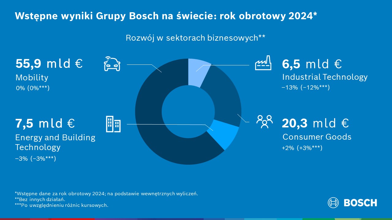 Dane dotyczące sprzedaży w poszczególnych sektorach działalności firmy Bosch wyraźnie odzwierciedlają ogólne trendy rynkowe. "Rok 2024 był wyjątkiem - wszystkie nasze główne rynki miały w tym samym czasie słabe wyniki" – powiedział dr Markus Forschner, członek zarządu i CFO Robert Bosch GmbH. Przychody ze sprzedaży w wysokości 55,9 mld euro oznaczają, że sektor biznesowy Mobility zbliżył się do poziomu obrotów roku poprzedniego. Pomimo kurczącego się rynku, przychody ze sprzedaży były na poziomie roku 2023, również po skorygowaniu o wpływ kursów wymiany walut. W dziedzinie Industrial Technology przychody ze sprzedaży wyniosły 6,5 mld euro, czyli o 13 procent mniej niż w roku poprzednim w ujęciu nominalnym i 12 procent mniej po skorygowaniu o wpływ kursów walutowych. Słaby sektor inżynierii mechanicznej szczególnie mocno uderzył w główne rynki Europy, Chin i Stanów Zjednoczonych. W sektorze Consumer Goods przychody ze sprzedaży wzrosły nominalnie o 2 procent do 20,3 mld euro. Po skorygowaniu o wpływ różnic kursowych były o 3 procent wyższe niż w roku poprzednim. Oznacza to, że Bosch ponownie rozwija się w branży dóbr konsumpcyjnych – po raz pierwszy od czasu spadku popytu pod koniec pandemii koronawirusa. Przychody ze sprzedaży w sektorze Energy and Building Technology wyniosły 7,5 mld euro. To oznacza spadek przychodów ze sprzedaży o 3 procent zarówno nominalnie jak i skorygowaniu o wpływ kursów walutowych. Wynikało to przede wszystkim ze złych nastrojów na europejskim rynku grzewczym.